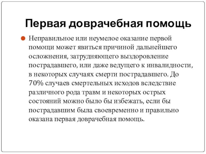 дальнейшего осложнения, затрудняющего выздоровление пострадавшего, или даже ведущего к инвалидности, в некоторых случаях смерти пострадавшего. До 70% случаев смертельных исходов вследствие различного рода травм и некоторых острых состояний можно было бы избежать, если бы пострадавшим была своевременно и правильно оказана первая доврачебная помощь.