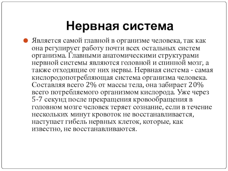 регулирует работу почти всех остальных систем организма. Главными анатомическими структурами нервной системы являются головной и спинной мозг, а также отходящие от них нервы. Нервная система - самая кислородопотребляющая система организма человека. Составляя всего 2% от массы тела, она забирает 20% всего потребляемого организмом кислорода. Уже через 5-7 секунд после прекращения кровообращения в головном мозге человек теряет сознание, если в течение нескольких минут кровоток не восстанавливается, наступает гибель нервных клеток, которые, как известно, не восстанавливаются.