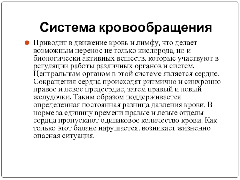 перенос не только кислорода, но и биологически активных веществ, которые участвуют в регуляции работы различных органов и систем. Центральным органом в этой системе является сердце. Сокращения сердца происходят ритмично и синхронно - правое и левое предсердие, затем правый и левый желудочки. Таким образом поддерживается определенная постоянная разница давления крови. В норме за единицу времени правые и левые отделы сердца пропускают одинаковое количество крови. Как только этот баланс нарушается, возникает жизненно опасная ситуация.