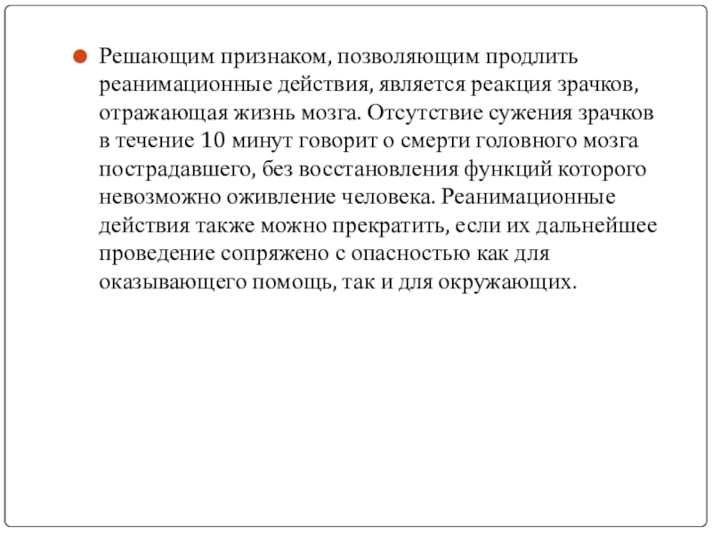 Слайд 39Решающим признаком, позволяющим продлить реанимационные действия, является реакция зрачков, отражающая жизнь