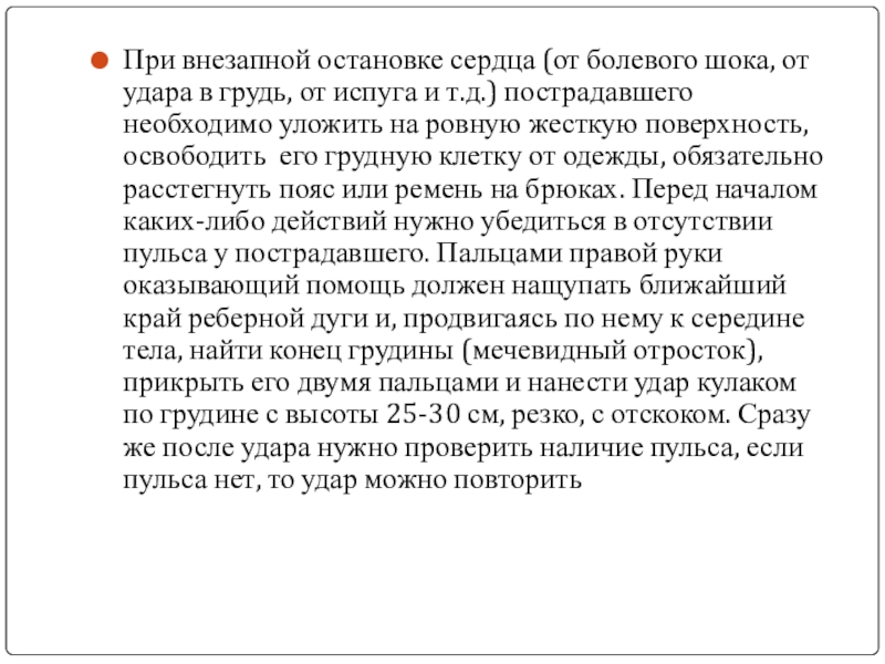 от испуга и т.д.) пострадавшего необходимо уложить на ровную жесткую поверхность, освободить его грудную клетку от одежды, обязательно расстегнуть пояс или ремень на брюках. Перед началом каких-либо действий нужно убедиться в отсутствии пульса у пострадавшего. Пальцами правой руки оказывающий помощь должен нащупать ближайший край реберной дуги и, продвигаясь по нему к середине тела, найти конец грудины (мечевидный отросток), прикрыть его двумя пальцами и нанести удар кулаком по грудине с высоты 25-30 см, резко, с отскоком. Сразу же после удара нужно проверить наличие пульса, если пульса нет, то удар можно повторить