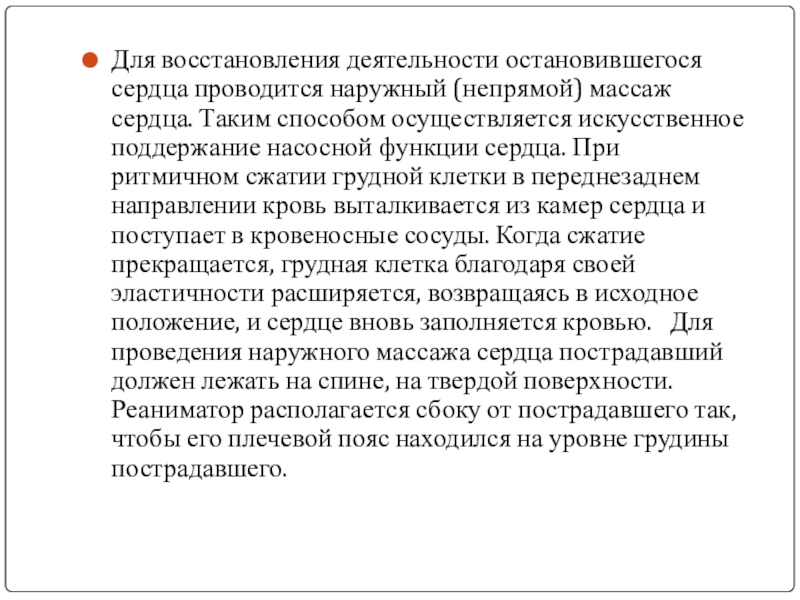 Слайд 34Для восстановления деятельности остановившегося сердца проводится наружный (непрямой) массаж сердца. Таким