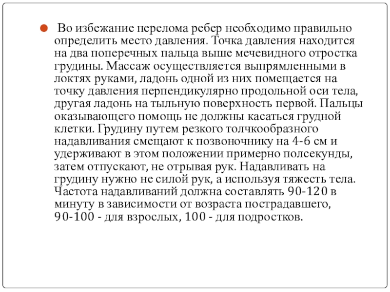 Слайд 35 Во избежание перелома ребер необходимо правильно определить место давления. Точка