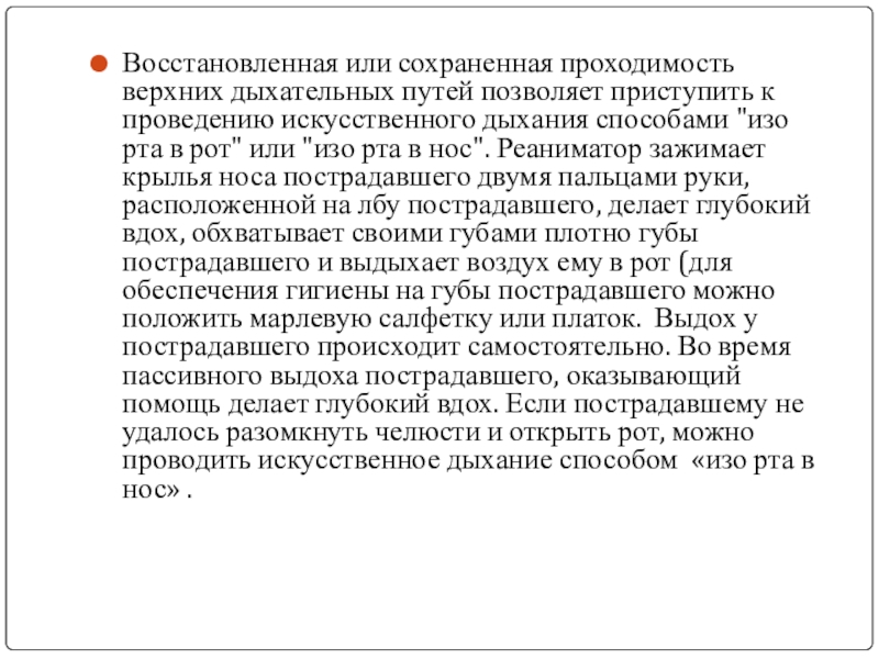 искусственного дыхания способами "изо рта в рот" или "изо рта в нос". Реаниматор зажимает крылья носа пострадавшего двумя пальцами руки, расположенной на лбу пострадавшего, делает глубокий вдох, обхватывает своими губами плотно губы пострадавшего и выдыхает воздух ему в рот (для обеспечения гигиены на губы пострадавшего можно положить марлевую салфетку или платок. Выдох у пострадавшего происходит самостоятельно. Во время пассивного выдоха пострадавшего, оказывающий помощь делает глубокий вдох. Если пострадавшему не удалось разомкнуть челюсти и открыть рот, можно проводить искусственное дыхание способом «изо рта в нос» .