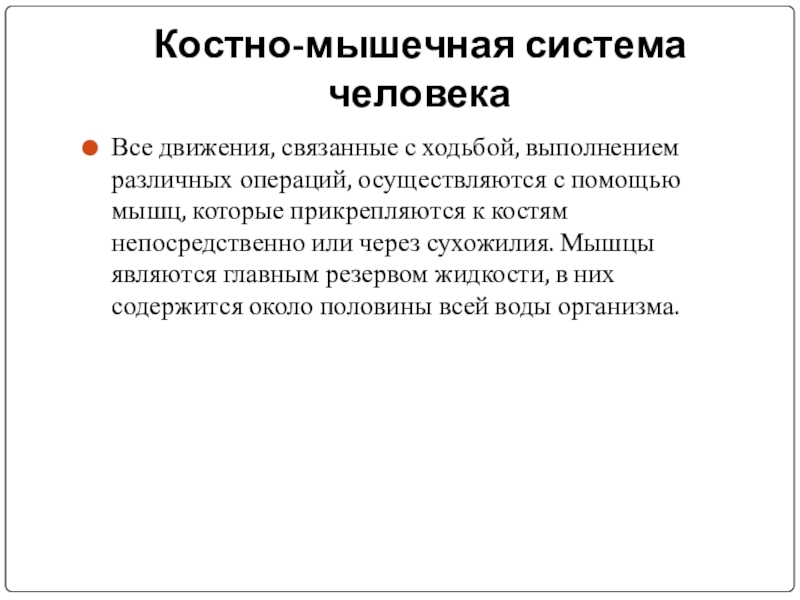 с помощью мышц, которые прикрепляются к костям непосредственно или через сухожилия. Мышцы являются главным резервом жидкости, в них содержится около половины всей воды организма.
