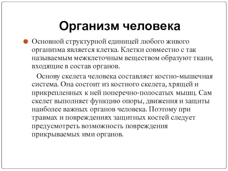 Основу скелета человека составляет костно-мышечная система. Она состоит из костного скелета, хрящей и прикрепленных к ней поперечно-полосатых мышц. Сам скелет выполняет функцию опоры, движения и защиты наиболее важных органов человека. Поэтому при травмах и повреждениях защитных костей следует предусмотреть возможность повреждения прикрываемых ими органов.