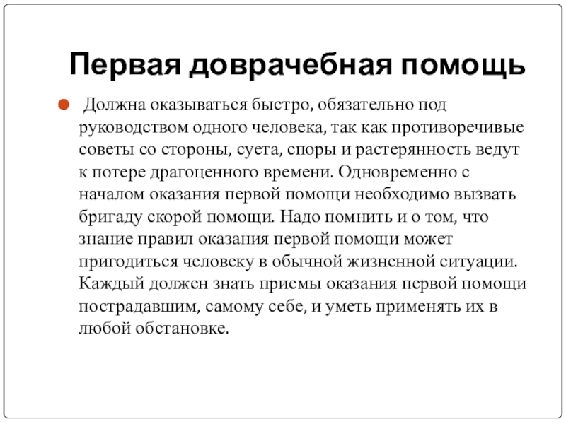 так как противоречивые советы со стороны, суета, споры и растерянность ведут к потере драгоценного времени. Одновременно с началом оказания первой помощи необходимо вызвать бригаду скорой помощи. Надо помнить и о том, что знание правил оказания первой помощи может пригодиться человеку в обычной жизненной ситуации. Каждый должен знать приемы оказания первой помощи пострадавшим, самому себе, и уметь применять их в любой обстановке.