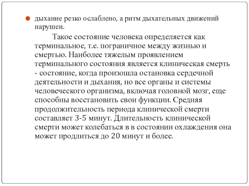 Слайд 26дыхание резко ослаблено, а ритм дыхательных движений нарушен.
