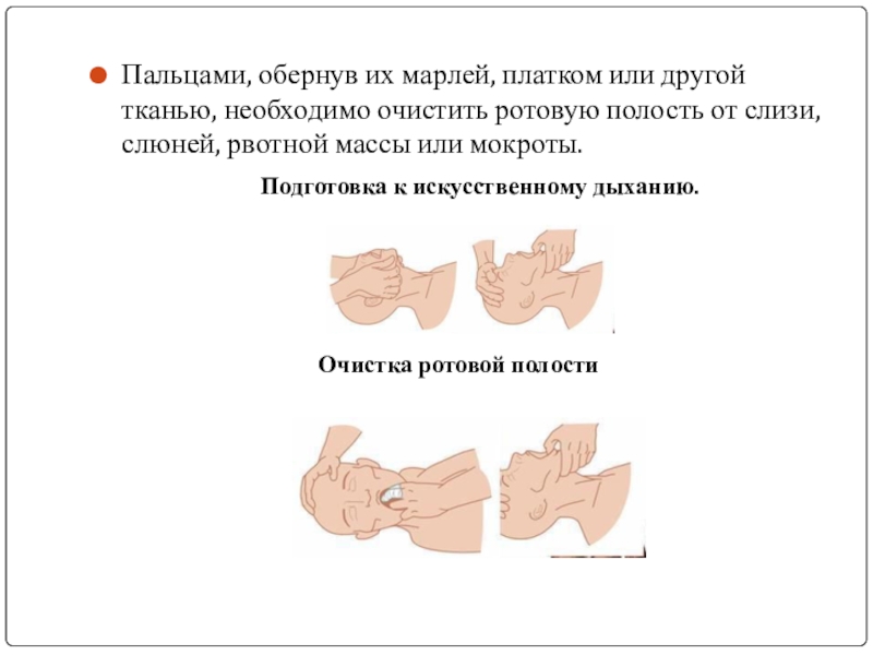 Слайд 30Пальцами, обернув их марлей, платком или другой тканью, необходимо очистить ротовую