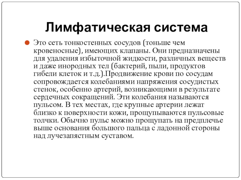 Они предназначены для удаления избыточной жидкости, различных веществ и даже инородных тел (бактерий, пыли, продуктов гибели клеток и т.д.).Продвижение крови по сосудам сопровождается колебаниями напряжения сосудистых стенок, особенно артерий, возникающими в результате сердечных сокращений. Эти колебания называются пульсом. В тех местах, где крупные артерии лежат близко к поверхности кожи, прощупываются пульсовые толчки. Обычно пульс можно прощупать на предплечье выше основания большого пальца с ладонной стороны над лучезапястным суставом.