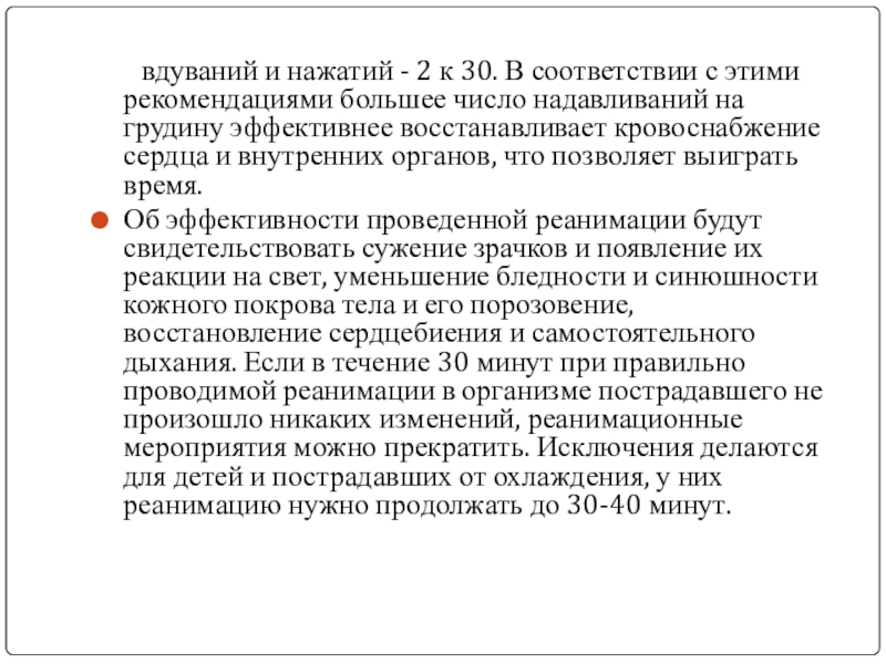 Об эффективности проведенной реанимации будут свидетельствовать сужение зрачков и появление их реакции на свет, уменьшение бледности и синюшности кожного покрова тела и его порозовение, восстановление сердцебиения и самостоятельного дыхания. Если в течение 30 минут при правильно проводимой реанимации в организме пострадавшего не произошло никаких изменений, реанимационные мероприятия можно прекратить. Исключения делаются для детей и пострадавших от охлаждения, у них реанимацию нужно продолжать до 30-40 минут.