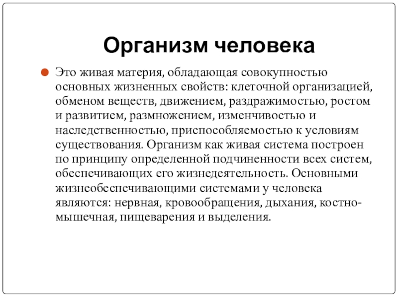обменом веществ, движением, раздражимостью, ростом и развитием, размножением, изменчивостью и наследственностью, приспособляемостью к условиям существования. Организм как живая система построен по принципу определенной подчиненности всех систем, обеспечивающих его жизнедеятельность. Основными жизнеобеспечивающими системами у человека являются: нервная, кровообращения, дыхания, костно-мышечная, пищеварения и выделения.