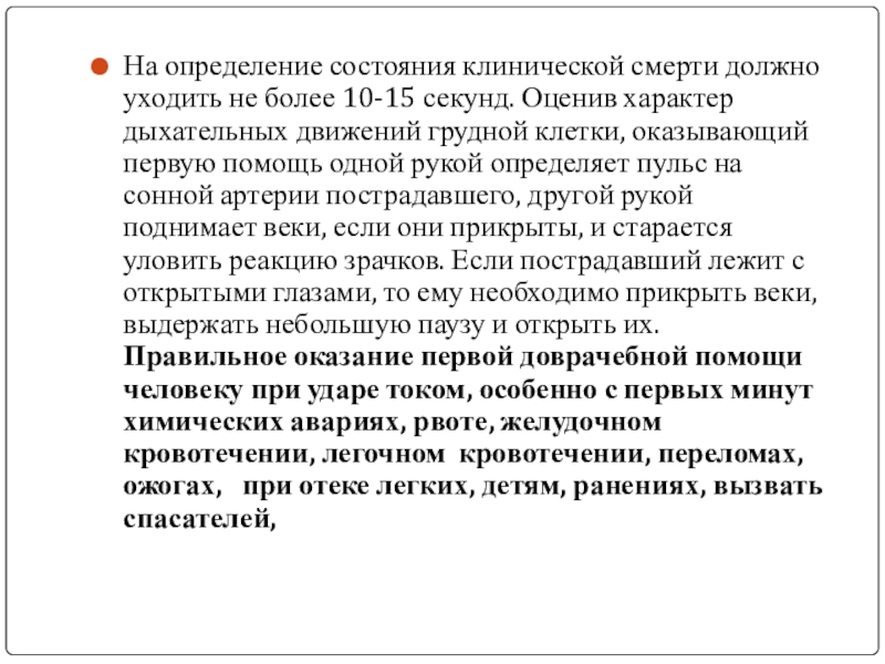 Оценив характер дыхательных движений грудной клетки, оказывающий первую помощь одной рукой определяет пульс на сонной артерии пострадавшего, другой рукой поднимает веки, если они прикрыты, и старается уловить реакцию зрачков. Если пострадавший лежит с открытыми глазами, то ему необходимо прикрыть веки, выдержать небольшую паузу и открыть их. Правильное оказание первой доврачебной помощи человеку при ударе током, особенно с первых минут химических авариях, рвоте, желудочном кровотечении, легочном кровотечении, переломах, ожогах, при отеке легких, детям, ранениях, вызвать спасателей,