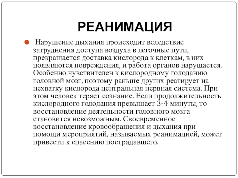 прекращается доставка кислорода к клеткам, в них появляются повреждения, и работа органов нарушается. Особенно чувствителен к кислородному голоданию головной мозг, поэтому раньше других реагирует на нехватку кислорода центральная нервная система. При этом человек теряет сознание. Если продолжительность кислородного голодания превышает 3-4 минуты, то восстановление деятельности головного мозга становится невозможным. Своевременное восстановление кровообращения и дыхания при помощи мероприятий, называемых реанимацией, может привести к спасению пострадавшего.