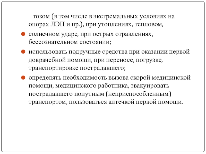 использовать подручные средства при оказании первой доврачебной помощи, при переносе, погрузке, транспортировке пострадавшего;