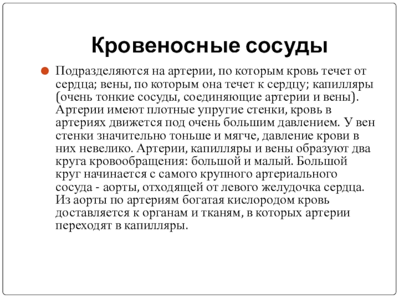 вены, по которым она течет к сердцу; капилляры (очень тонкие сосуды, соединяющие артерии и вены). Артерии имеют плотные упругие стенки, кровь в артериях движется под очень большим давлением. У вен стенки значительно тоньше и мягче, давление крови в них невелико. Артерии, капилляры и вены образуют два круга кровообращения: большой и малый. Большой круг начинается с самого крупного артериального сосуда - аорты, отходящей от левого желудочка сердца. Из аорты по артериям богатая кислородом кровь доставляется к органам и тканям, в которых артерии переходят в капилляры.