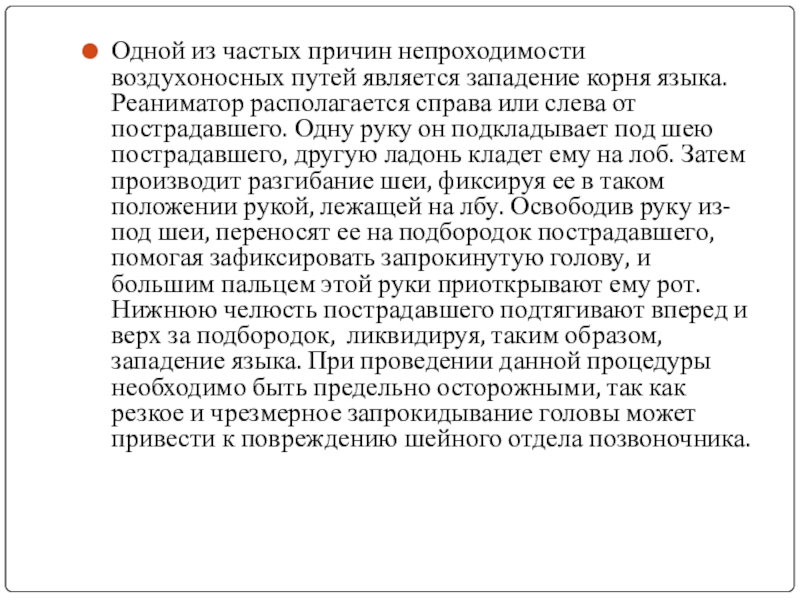 Реаниматор располагается справа или слева от пострадавшего. Одну руку он подкладывает под шею пострадавшего, другую ладонь кладет ему на лоб. Затем производит разгибание шеи, фиксируя ее в таком положении рукой, лежащей на лбу. Освободив руку из-под шеи, переносят ее на подбородок пострадавшего, помогая зафиксировать запрокинутую голову, и большим пальцем этой руки приоткрывают ему рот. Нижнюю челюсть пострадавшего подтягивают вперед и верх за подбородок, ликвидируя, таким образом, западение языка. При проведении данной процедуры необходимо быть предельно осторожными, так как резкое и чрезмерное запрокидывание головы может привести к повреждению шейного отдела позвоночника.