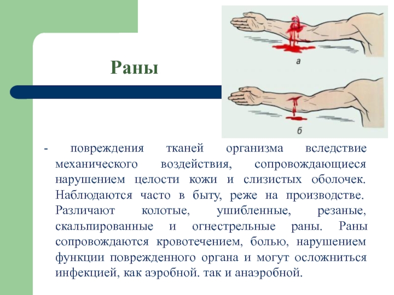 механического воздействия, сопровождающиеся нарушением целости кожи и слизистых оболочек. Наблюдаются часто в быту, реже на производстве. Различают колотые, ушибленные, резаные, скальпированные и огнестрельные раны. Раны сопровождаются кровотечением, болью, нарушением функции поврежденного органа и могут осложниться инфекцией, как аэробной. так и анаэробной.