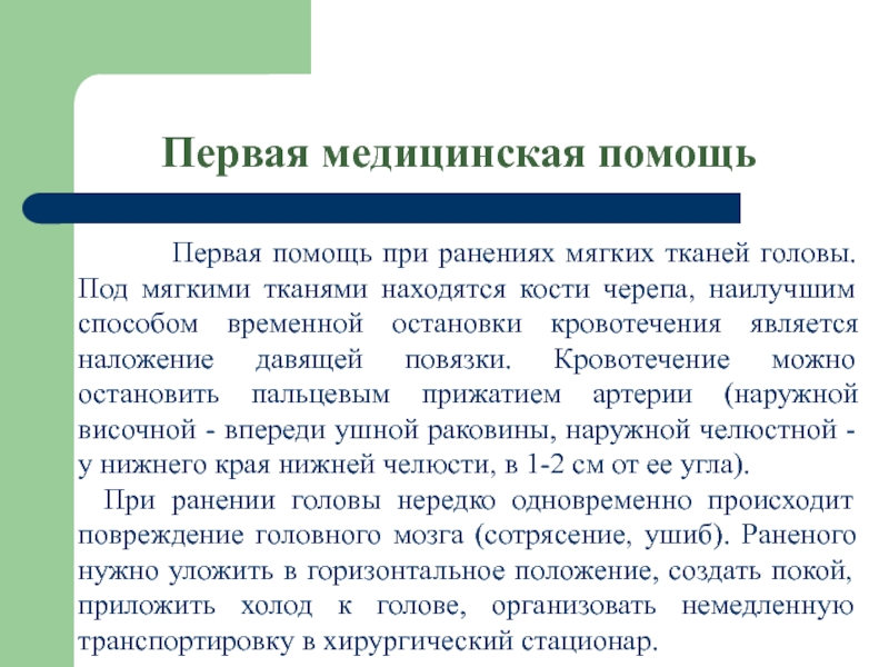 Первая медицинская помощь    Первая помощь при ранениях мягких тканей головы. Под мягкими тканями находятся