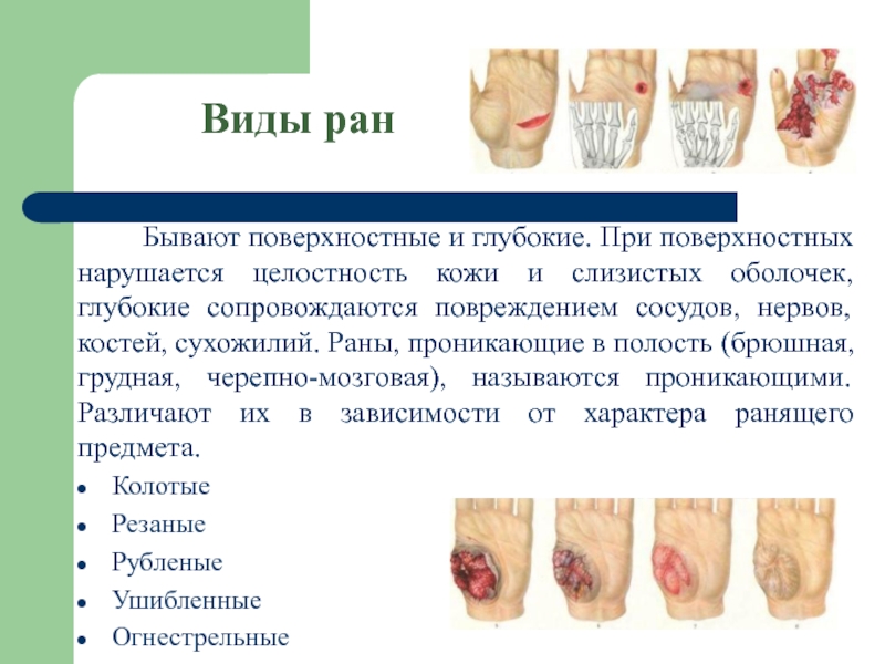 глубокие. При поверхностных нарушается целостность кожи и слизистых оболочек, глубокие сопровождаются повреждением сосудов, нервов, костей, сухожилий. Раны, проникающие в полость (брюшная, грудная, черепно-мозговая), называются проникающими. Различают их в зависимости от характера ранящего предмета.