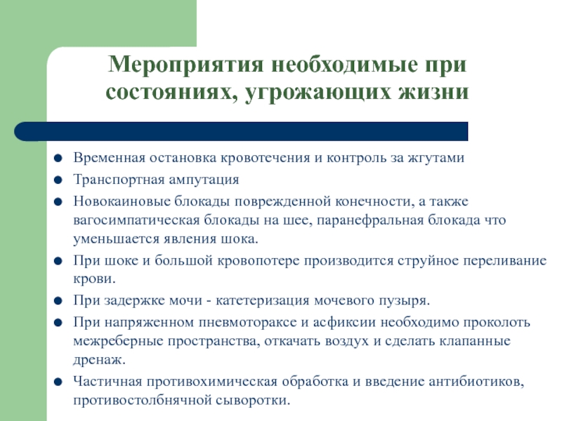 Мероприятия необходимые при состояниях, угрожающих жизни Временная остановка кровотечения и контроль за жгутами Транспортная ампутация Новокаиновые блокады