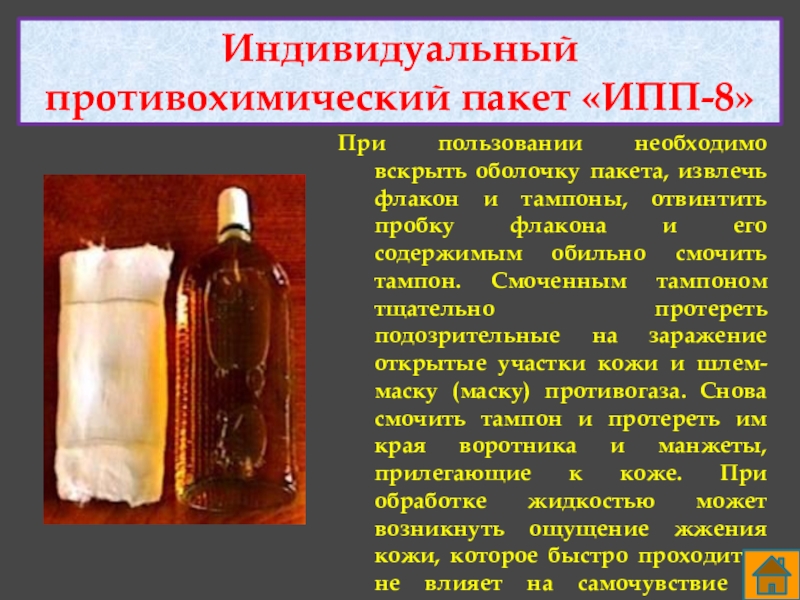 флакон и тампоны, отвинтить пробку флакона и его содержимым обильно смочить тампон. Смоченным тампоном тщательно протереть подозрительные на заражение открытые участки кожи и шлем-маску (маску) противогаза. Снова смочить тампон и протереть им края воротника и манжеты, прилегающие к коже. При обработке жидкостью может возникнуть ощущение жжения кожи, которое быстро проходит и не влияет на самочувствие и работоспособность.