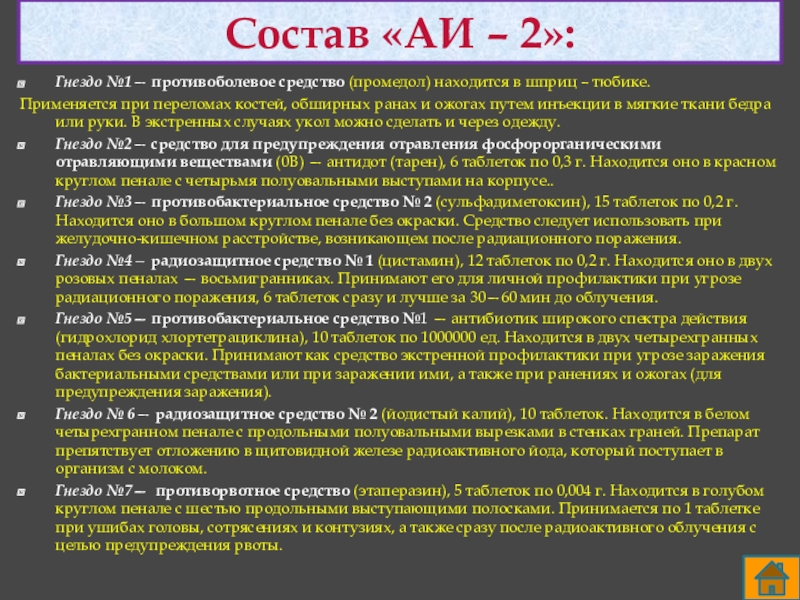 оказания самопомощи и взаимопомощи при ранениях и ожогах (для снятия боли), предупреждения или ослабления поражения радиоактивными, отравляющими или аварийно химически опасными веществами (АХОВ), а также для предупреждения заболевания инфекционными болезнями. В аптечке находится набор медицинских средств, распределенных по гнездам в пластмассовой коробочке. Размер коробочки 90х100х20 мм, масса 130 г. Размер и форма коробочки позволяют носить ее в кармане и всегда иметь при себе.