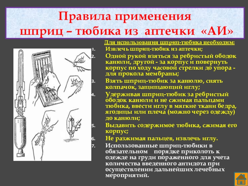 Использованные шприц-тюбики в обязательном порядке приколоть к одежде на груди пораженного для учета количества введенного антидота при осуществлении дальнейших лечебных мероприятий.