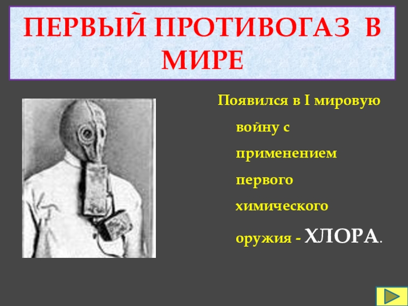 Слайд 17ПЕРВЫЙ ПРОТИВОГАЗ В МИРЕ
