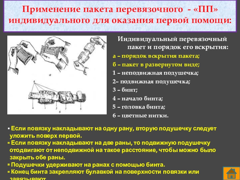 Применение пакета перевязочного - «ПП» индивидуального для оказания первой помощи: