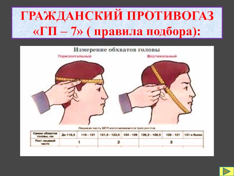Слайд 21ГРАЖДАНСКИЙ ПРОТИВОГАЗ «ГП – 7» ( правила подбора):