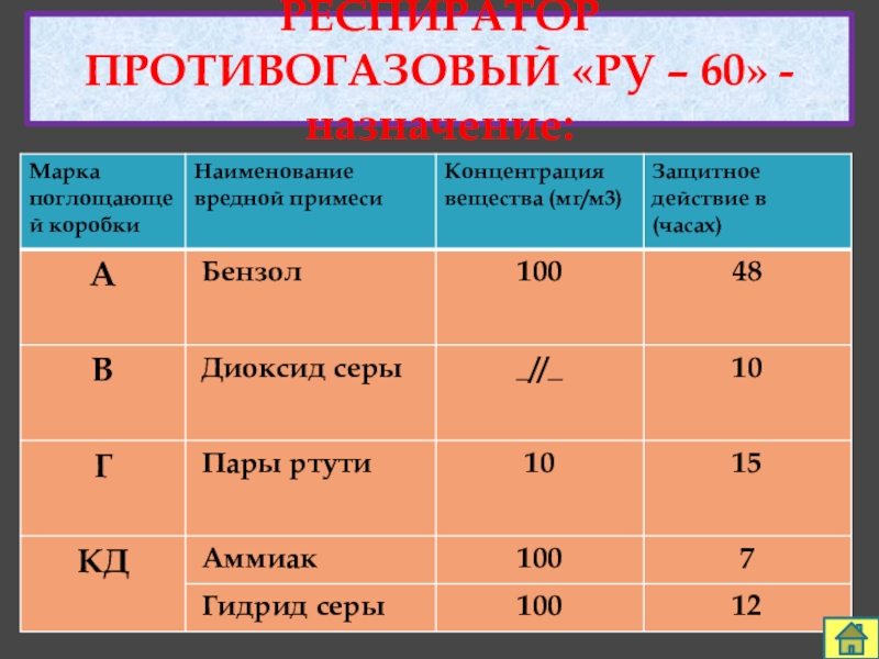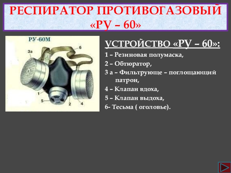 Слайд 16РЕСПИРАТОР ПРОТИВОГАЗОВЫЙ «РУ – 60» - назначение: