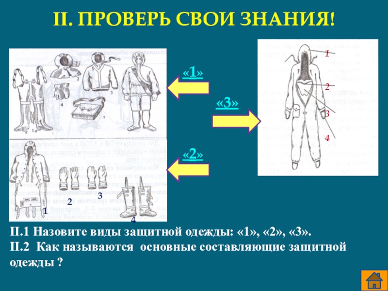 II.1 Назовите виды защитной одежды: «1», «2», «3».