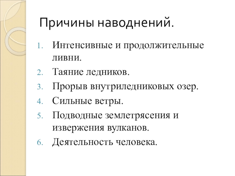 Перечислите природные явления гидрологического происхождения, которые могут вызвать наводнения.