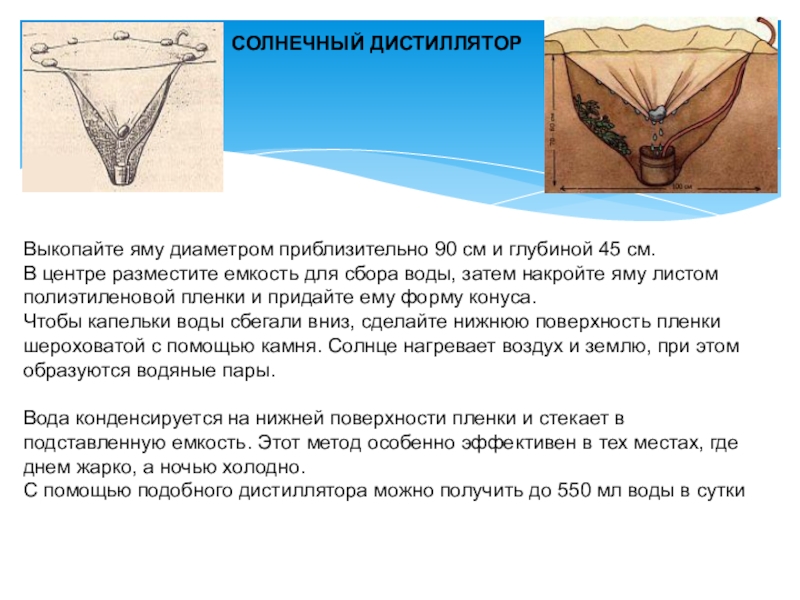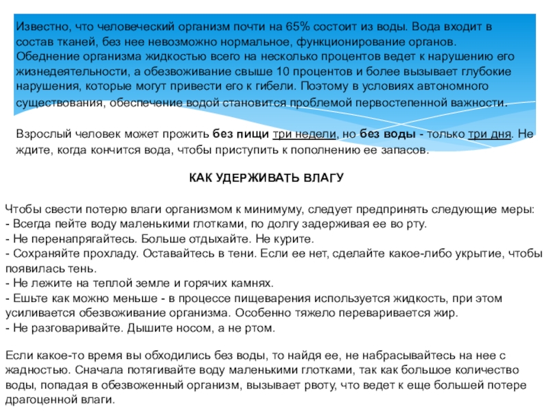 Если какое-то время вы обходились без воды, то найдя ее, не набрасывайтесь на нее с жадностью. Сначала потягивайте воду маленькими глотками, так как большое количество воды, попадая в обезвоженный организм, вызывает рвоту, что ведет к еще большей потере драгоценной влаги.