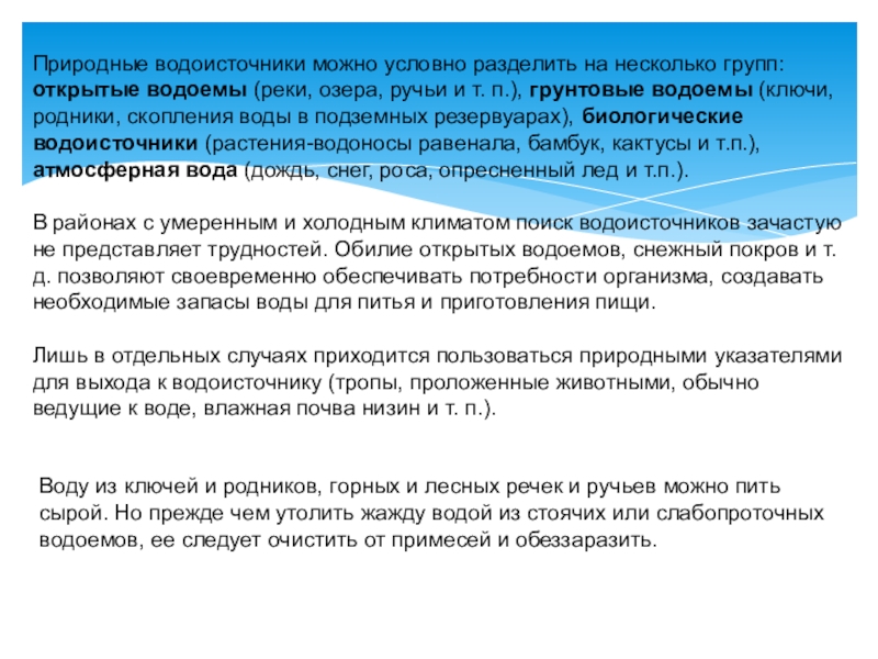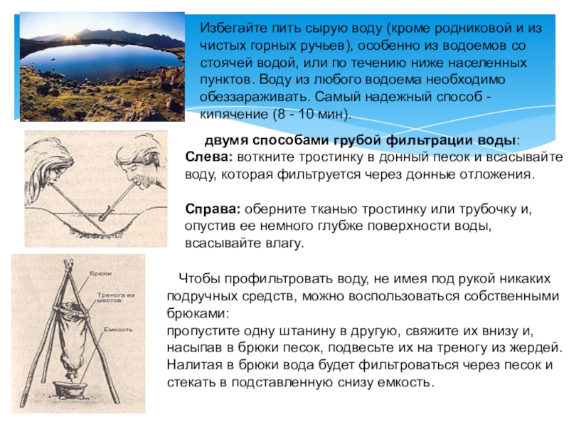 Воду из ключей и родников, горных и лесных речек и ручьев можно пить сырой. Но прежде чем утолить жажду водой из стоячих или слабопроточных водоемов, ее следует очистить от примесей и обеззаразить.