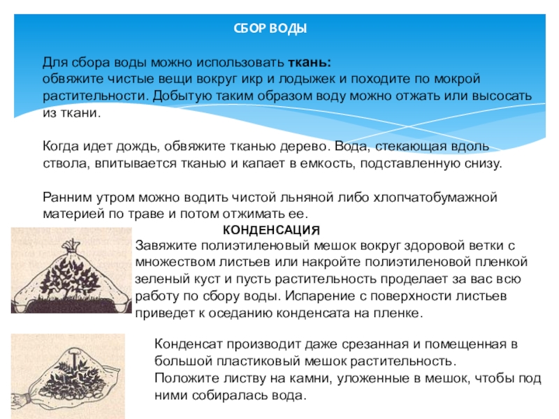 Завяжите полиэтиленовый мешок вокруг здоровой ветки с множеством листьев или накройте полиэтиленовой пленкой зеленый куст и пусть растительность проделает за вас всю работу по сбору воды. Испарение с поверхности листьев приведет к оседанию конденсата на пленке.