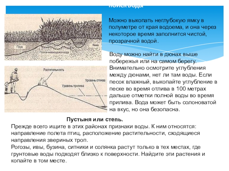 Воду можно найти в дюнах выше побережья или на самом берегу. Внимательно осмотрите углубления между дюнами, нет ли там воды. Если песок влажный, выкопайте углубление в песке во время отлива в 100 метрах дальше отметки полной воды во время прилива. Вода может быть солоноватой на вкус, но она безопасна.