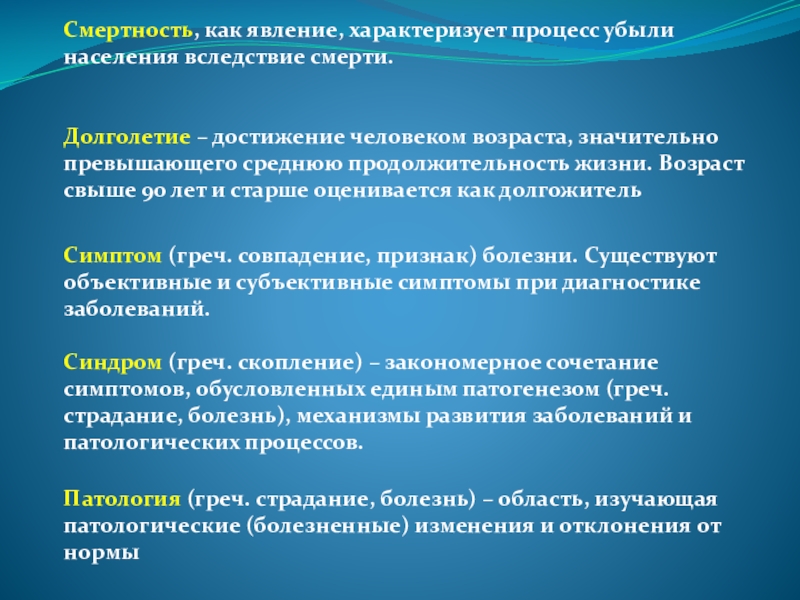 Синдром (греч. скопление) – закономерное сочетание симптомов, обусловленных единым патогенезом (греч. страдание, болезнь), механизмы развития заболеваний и патологических процессов.