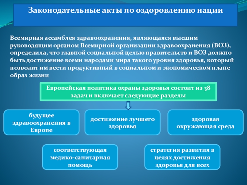 Европейская политика охраны здоровья состоит из 38 задач и включает следующие разделы