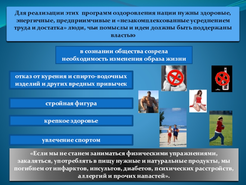«Если мы не станем заниматься физическими упражнениями, закаляться, употреблять в пищу нужные и натуральные продукты, мы погибнем от инфарктов, инсультов, диабетов, психических расстройств, аллергий и прочих напастей».