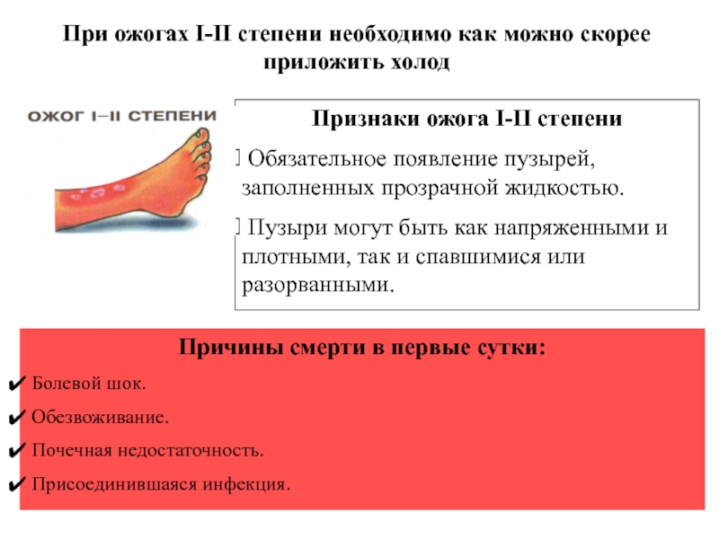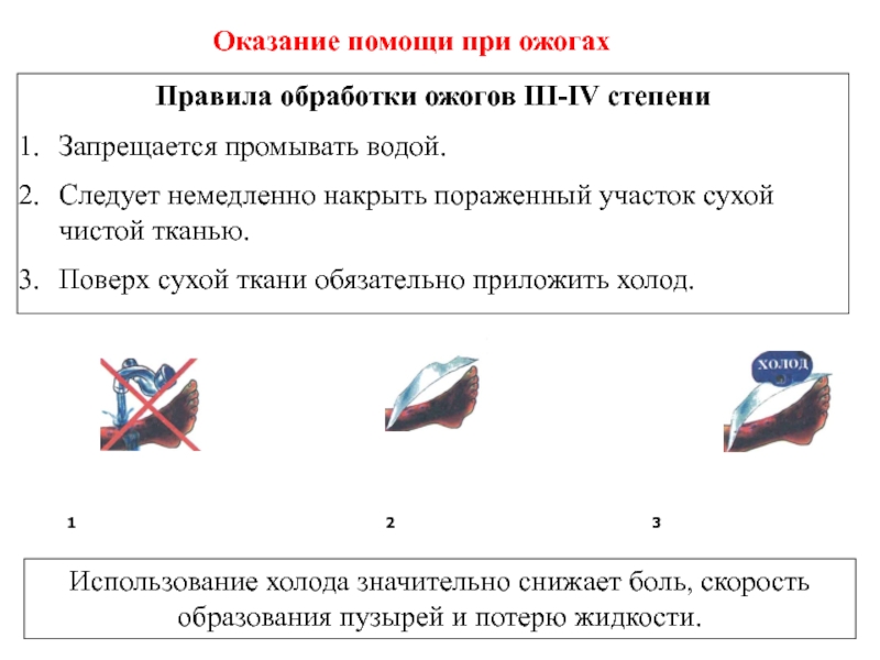 Использование холода значительно снижает боль, скорость образования пузырей и потерю жидкости.