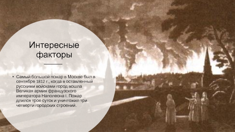 когда в оставленный русскими войсками город вошла Великая армия французского императора Наполеона I. Пожар длился трое суток и уничтожил три четверти городских строений.
