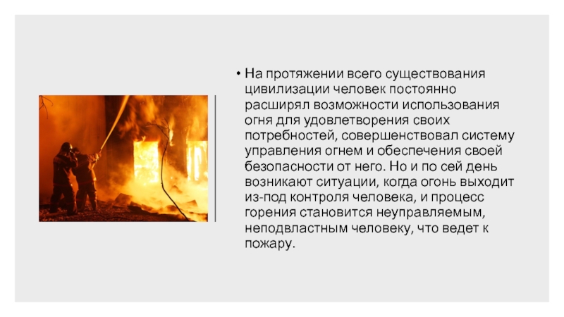 для удовлетворения своих потребностей, совершенствовал систему управления огнем и обеспечения своей безопасности от него. Но и по сей день возникают ситуации, когда огонь выходит из-под контроля человека, и процесс горения становится неуправляемым, неподвластным человеку, что ведет к пожару.