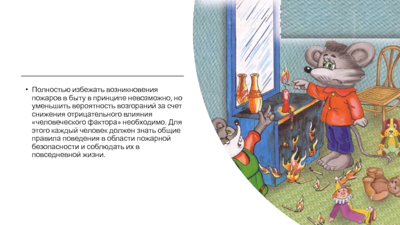 Слайд 20Полностью избежать возникновения пожаров в быту в принципе невозможно, но уменьшить