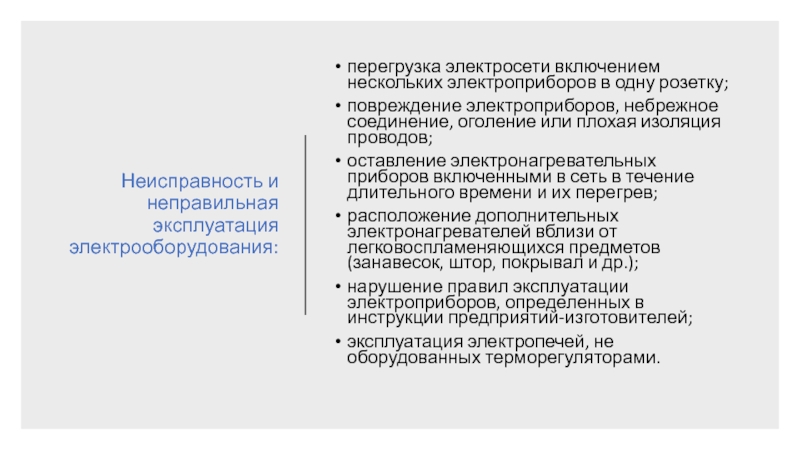 Слайд 13Неисправность и неправильная эксплуатация электрооборудования: