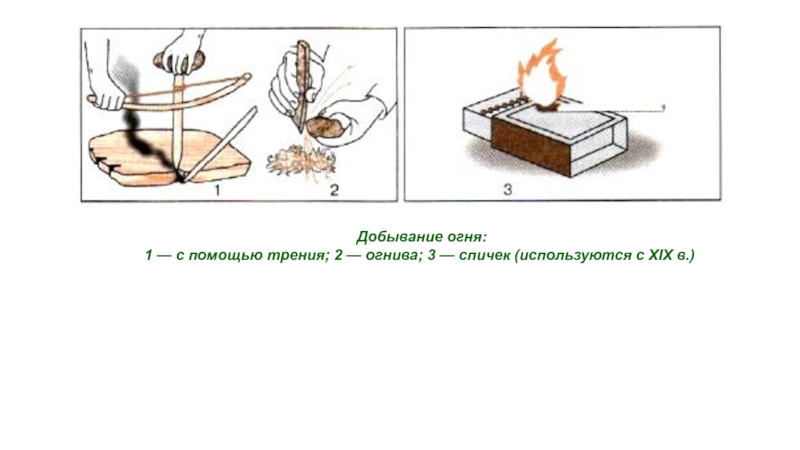 1 — с помощью трения; 2 — огнива; 3