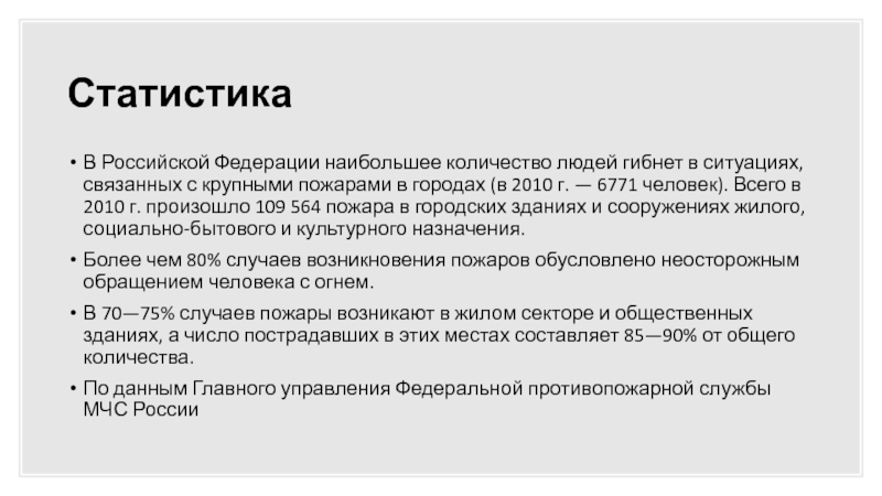 крупными пожарами в городах (в 2010 г. — 6771 человек). Всего в 2010 г. произошло 109 564 пожара в городских зданиях и сооружениях жилого, социально-бытового и культурного назначения.