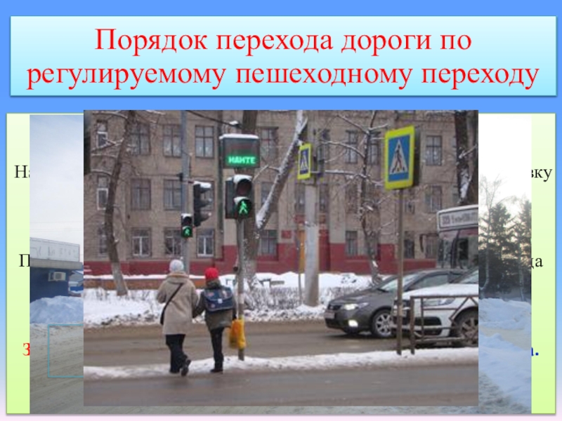 Слайд 15Порядок перехода дороги по регулируемому пешеходному переходу