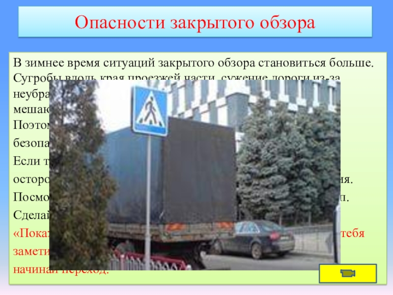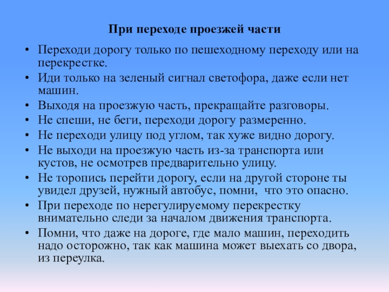 Не выходи на проезжую часть из-за транспорта или кустов, не осмотрев предварительно улицу.